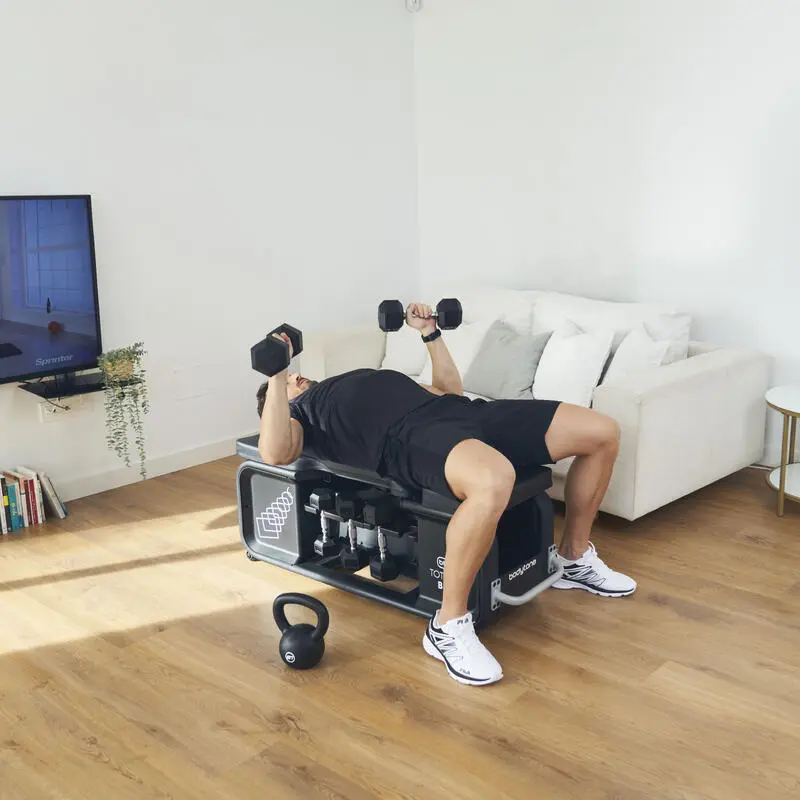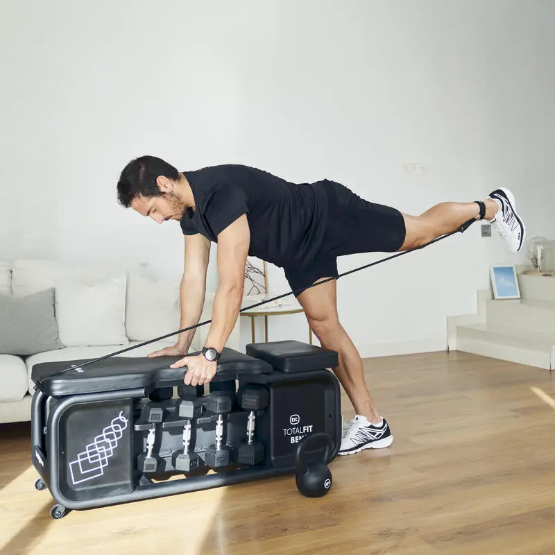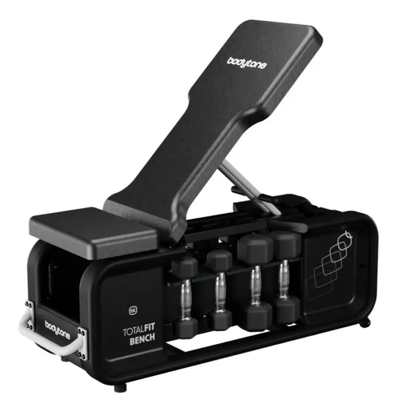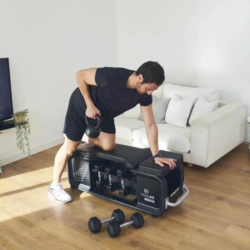 Compra en Decathlon Banco de musculaci贸n multifunci贸n Bodytone TFB Negro El Total Fit Bench cuenta con soporte dise帽ado para guardar hasta 4 pares de mancuernas y cajoneras donde guardar 2 kettlebells, bandas el谩sticas y m谩s. No incluye peque帽o material de entrenamiento.