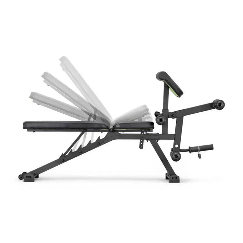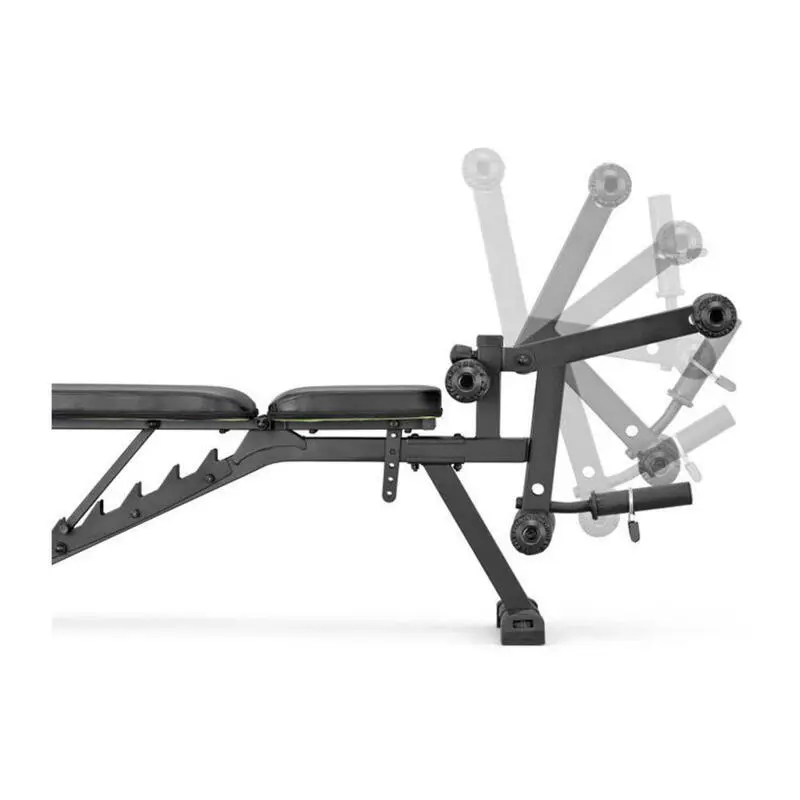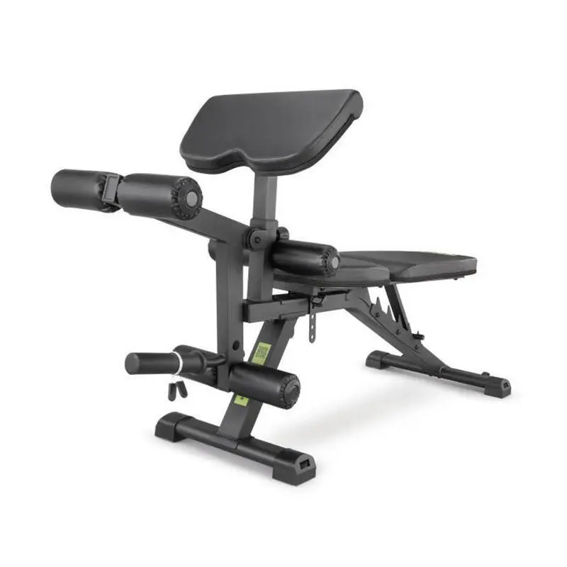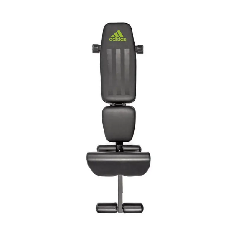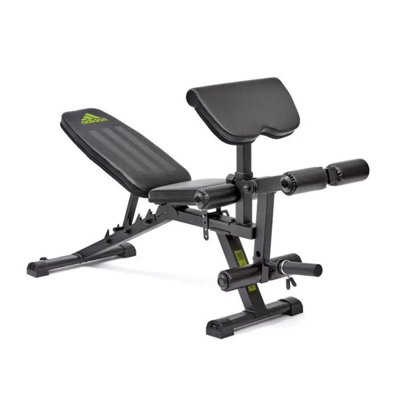 Compra en Decathlon Banco Multiposición Adidas Performance Training Incluye Curl de brazo para trabajar los bíceps y desarrollador de pierna con soporte para pesas.