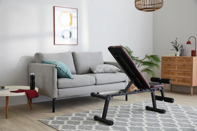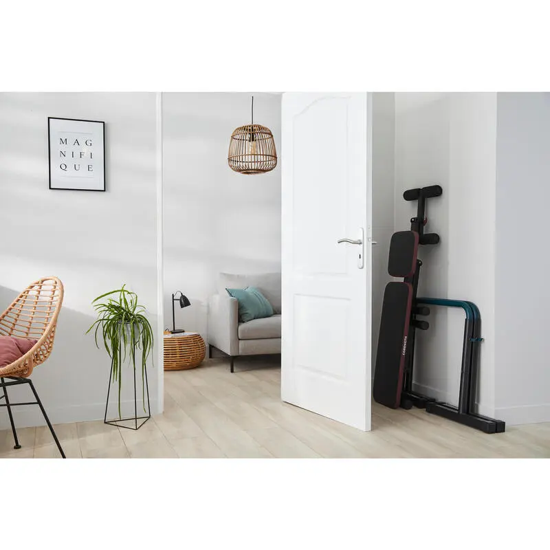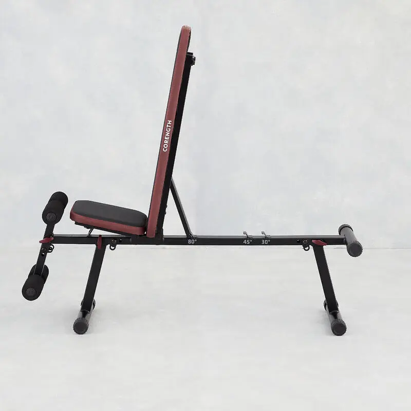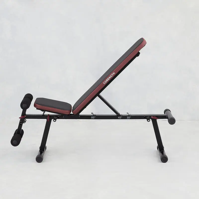 Compra en Decathlon Banco musculación pesas y abdominales plegable Corength Este banco de pesas no tiene montaje, solo tienes que abrir el producto para empezar a utilizarlo. Se puede desmontar la parte para el agarre de pies.