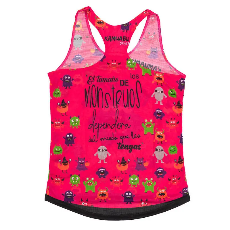 CAMISETA DE RUNNING #MONSTRUOS Para MUJER – KAMUABU Color Rosa De Tirantes