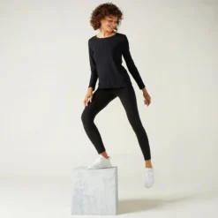Camiseta Fitness Manga Larga B谩sica Algod贸n Mujer Domyos Negro