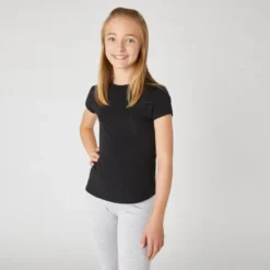 Compra en Decathlon Camiseta gimnasia deportiva manga corta transpirable Niños Domyos 500 Una camiseta vaporosa y transpirable para las actividades deportivas de los niños en todos los terrenos y en el colegio.