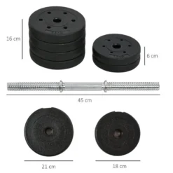 Compra en Decathlon Juego de mancuernas ajustable 30KG con barra HOMCOM 43x18x7,5 cm ngero Las mancuernas ajustables de HOMCOM es lo que necesitas para tus entrenamientos en casa. Gracias a los 12 discos con diferentes pesos puedes ajustar la carga según tu programa de entrenamiento.