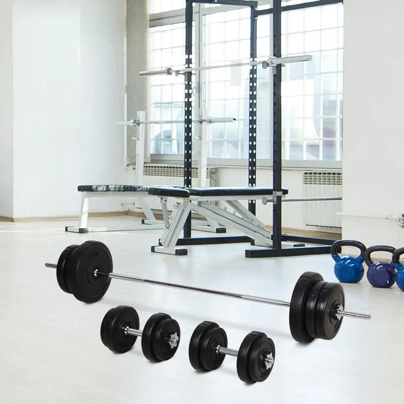 Compra en Decathlon Juego de pesas con mancuernas HOMCOM negro Ø25×35 cm Si quieres ejercitarte tus músculos, este conjunto de pesos y barras de HOMCOM te será de gran utilidad. Cuenta con 14 discos de 4 pesos diferentes y 3 barras, 1 larga y 2 cortas.