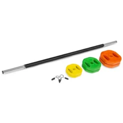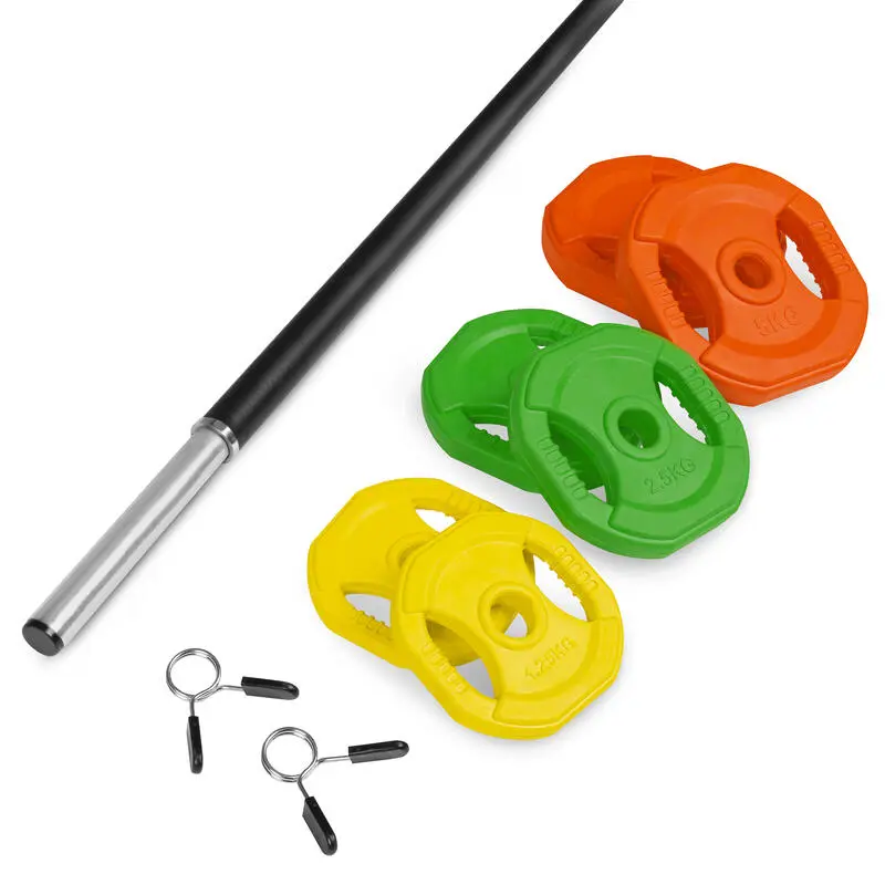 Compra en Decathlon Kit Barra Musculación 20 kg Spokey Omni Juego de 20 kg compuesto por 6 pesos (2x 1,25 kg, 2x 2,5 kg, 2x 5 kg), 2 abrazaderas y una barra de 1,4 m.