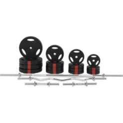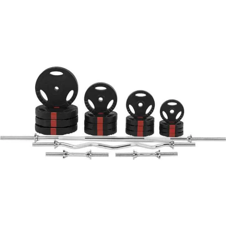 Compra en Decathlon Kit Completo Musculaci贸n Gorilla Sports 100Kg Discos Triple Agarre Set completo para que el principiante desarrolle pectorales, b铆ceps y tr铆ceps. Discos recubiertos de pl谩stico. Barra de 30 mm de di谩metro compatible con todos los discos de 31 mm.