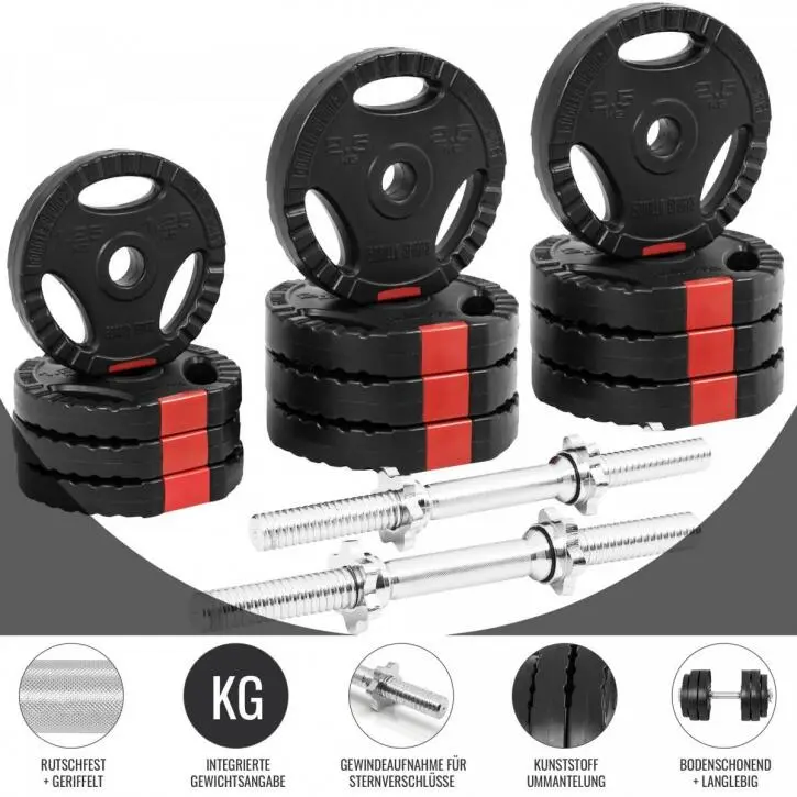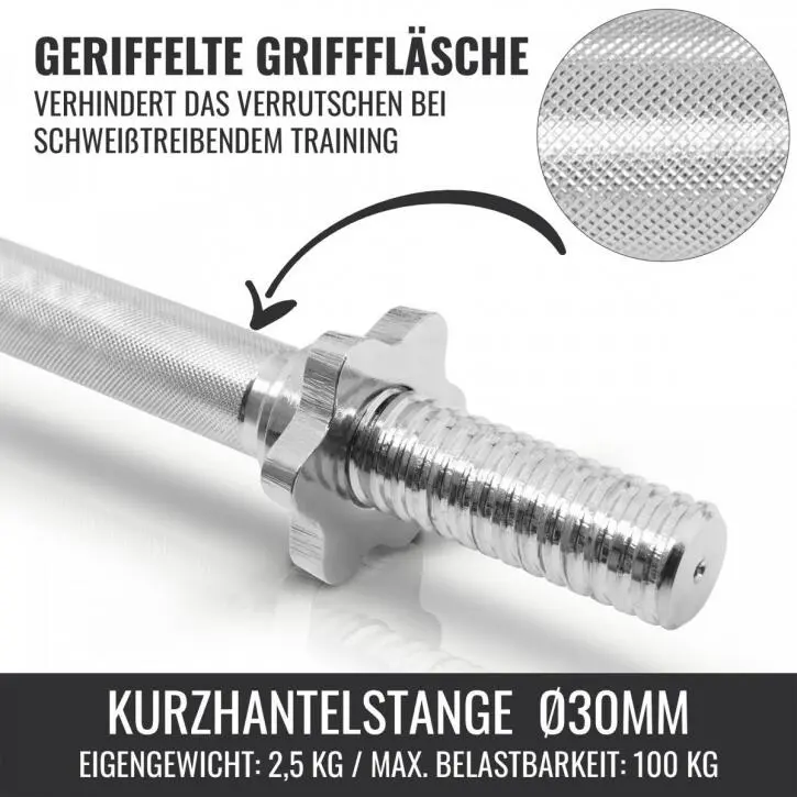 Compra en Decathlon Kit Mancuernas Gorilla Sports Cromado/Negro 30Kg Diámetro 30/31 mm Este set te ofrece muchas oportunidades para ejercicios efectivos que fortalecen sus brazos, tronco y piernas. Discos 4×1,25kg , 8×2,5Kg. Barras: 42cm