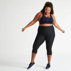 Compra en Decathlon Leggings fitness talla grande con bolsillo teléfono Domyos negro Un corte 7/8 para unos leggings deportivos transpirables y ventilados, diseñados para todas las prácticas de fitness.