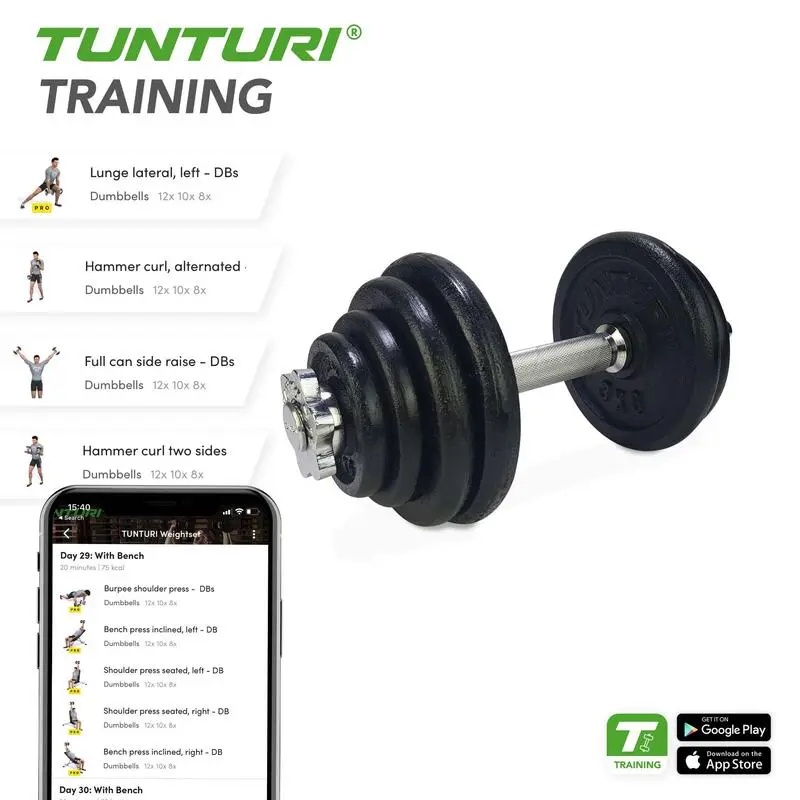 Compra en Decathlon Mancuerna Tunturi Peso: 20kg Este producto es ideal para cualquier tipo de usuario, y es perfecto para entrenar en casa.
