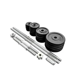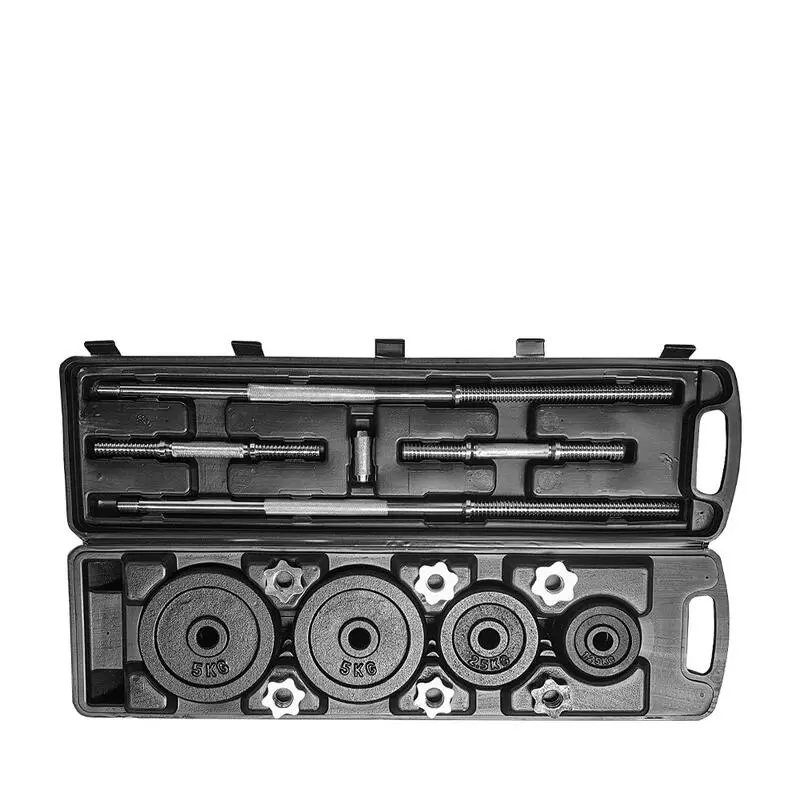 Compra en Decathlon JUEGO DE MANCUERNAS Y BARRA DE MUSCULACION 50KG El set de entrenamiento con barra y mancuernas ajustables es la mejor opción para entrenar donde y cuando quieras. Tienes 50 kg para entrenar.